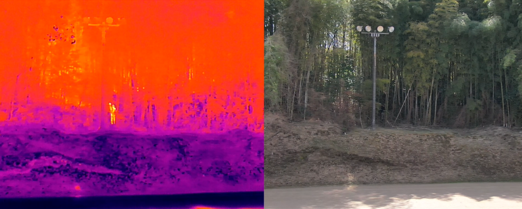 赤外線カメラは熱源を感知するため、目視では確認できない対象を捉えることができます。これは、崩落した建物や山林、暗闇の中などで行う要救助者の捜索活動に有効的です。その他にも、林野火災での残火確認や高所での温度確認などにも使用することができます。ですが、赤外線カメラにはズーム機能の限界や環境によって視認性が低下する場合もあるため、それらに考慮した運行や飛行計画を設定することで、より効果的に活用することができます。