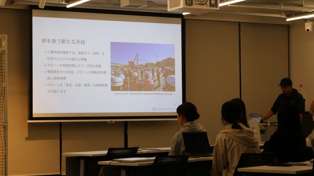 また、災害対応におけるドローンの活用例や有効性を、動画での紹介を交えながらご説明しました。未来を開くドローンの可能性やその技術力を学生の皆さんに存分に知っていただく機会となりました。