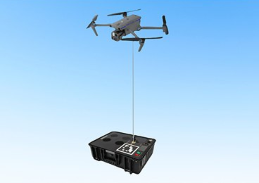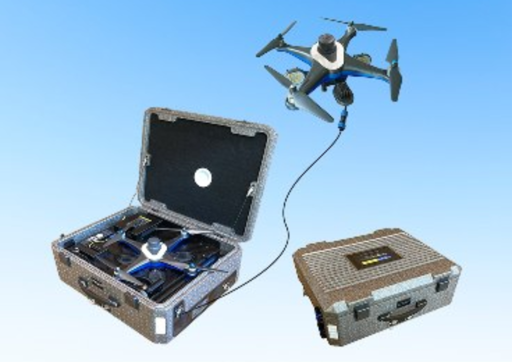 CSP_EVOというドローン機体専用の有線電源供給ユニットとなっています。ドローンと組み合わせることで長時間の連続飛行が可能となり、ハイブリットドローン(内燃機関を用いて発電し、その電力でモーターを駆動することで飛行する)として運用できます。